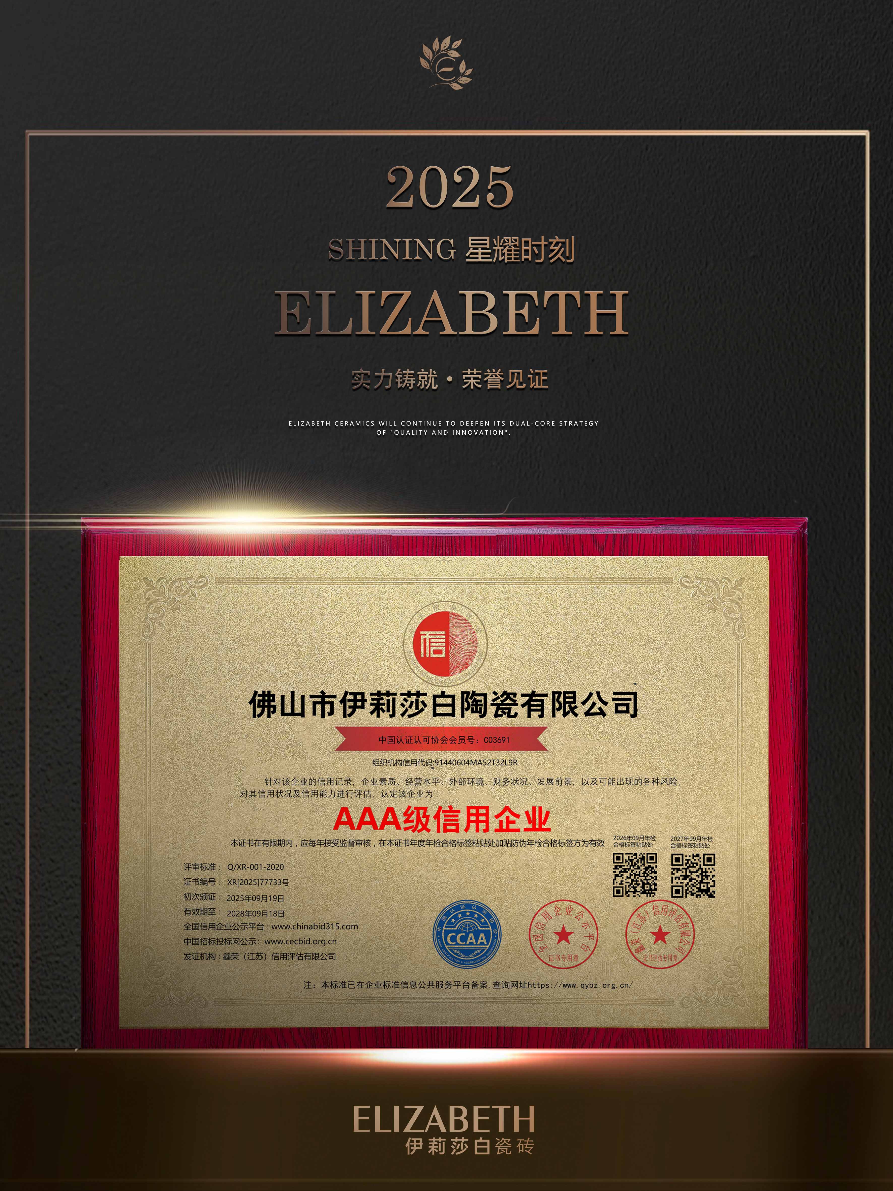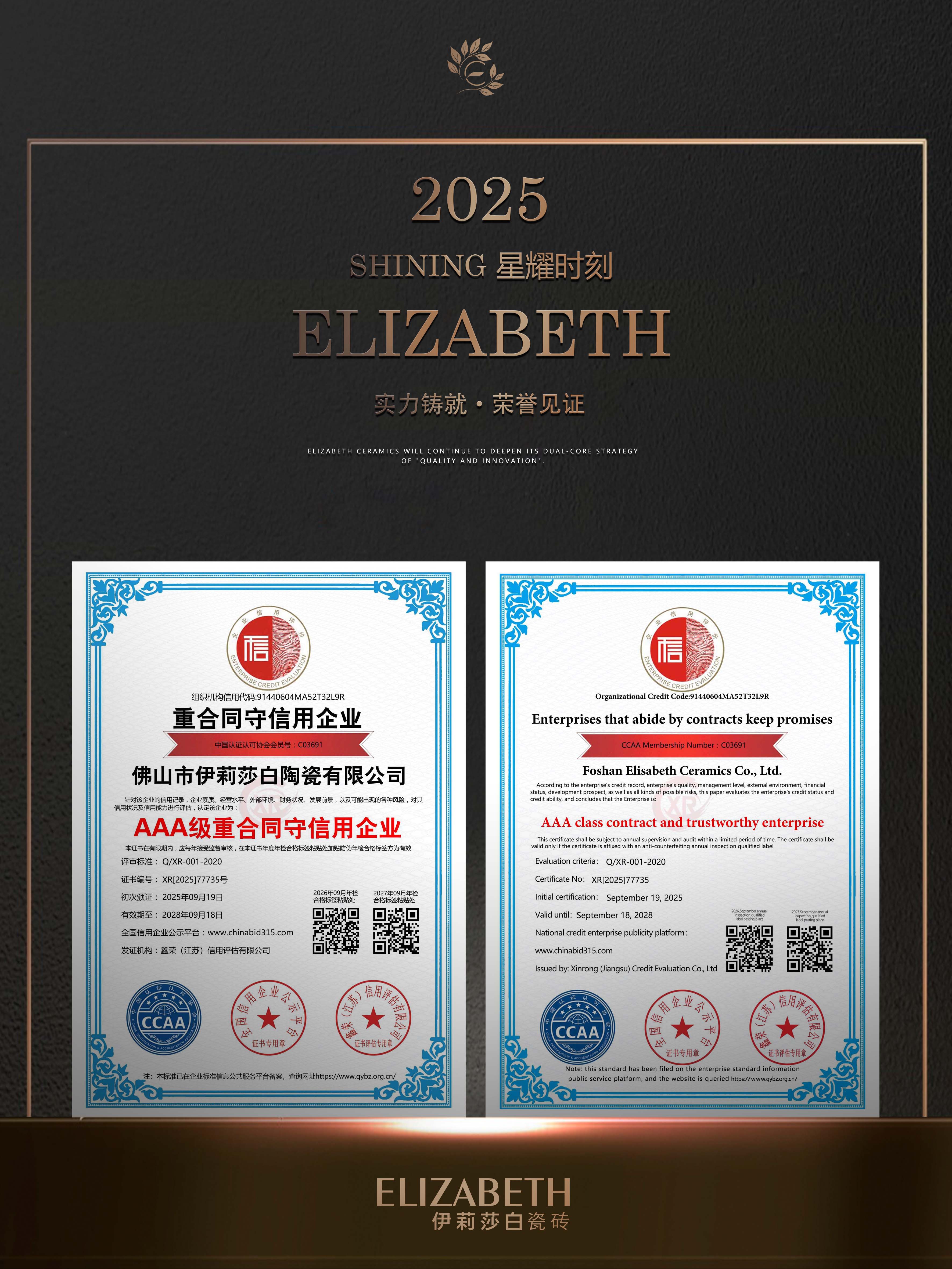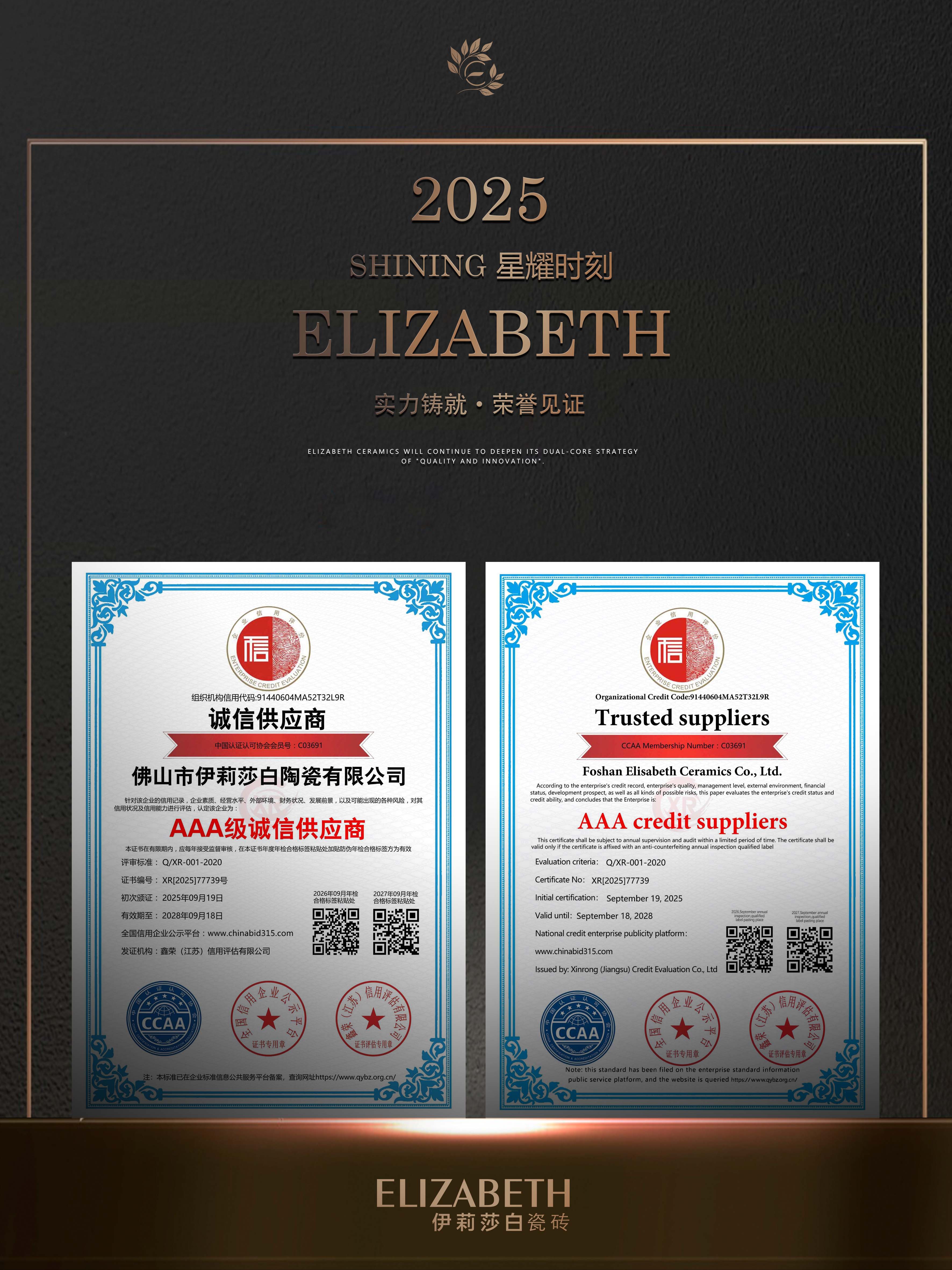 With outstanding credit performance, solid corporate quality and quality services, the brand has won a series of key AAA-level corporate certifications:AAA classservicesand trustworthy enterprise、AAA class contract and trustworthy enterprise、AAA class quality and trustworthy enterprise、AAA level integrity management model unit、AAA quality service integrity unit、AAA credit suppliers.AAA is the highest corporate credit rating,it is both authoritative recognition of the brand’s strength and solid credit assurance for consumers.For years, ELIZABETH Ceramics has strictly controlled quality,high-standard full-process management, adhered to integrity service, and wholeheartedly solved consumers’ problems.